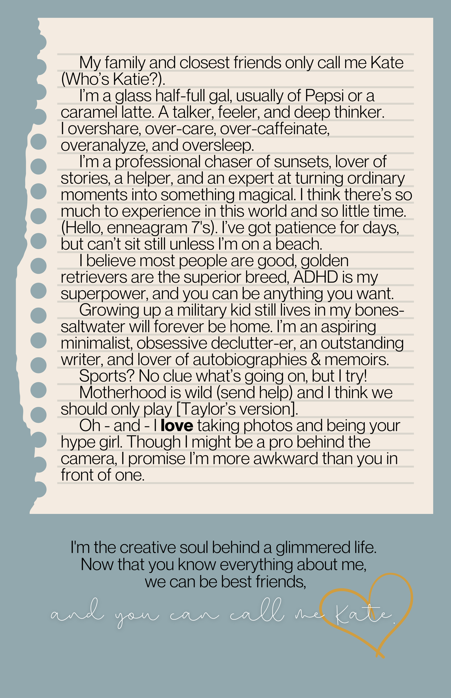 I’m Katie—a storyteller, photographer, writer, and enthusiast for all things authentic and heartfelt. Based near Wellsburg, Iowa, I find joy in capturing life’s fleeting moments and preserving them as cherished memories. Whether I’m behind the lens or sharing my reflections through writing, I’m driven by a love for connection and a passion for celebrating the beauty in everyday life.As the creative force behind A Glimmered Life, I offer a variety of photography services, from Fresh 48 sessions that honor the magic of new beginnings to senior portraits, family milestones, and youth sports. My goal is to create images that are as genuine and unique as the people in them.When I’m not photographing or writing, I’m finding glimmers of joy in the world around me. Through my self-published journal, The 365 Glimmer Challenge, I encourage others to discover their own moments of light and positivity every day.I love travel, spontaneity, and stories that inspire. My adventures, whether exploring the breathtaking landscapes of Scotland or simply chasing the perfect morning latte, fuel my creativity and remind me to slow down and savor life’s details.Let’s create something unforgettable together ✨